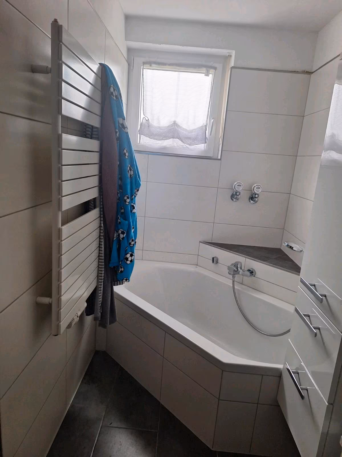 Badezimmer mit Eckbadewanne und Fenster